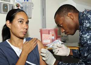 Hospital Corpsman 3rd Class Durell Jacobs administers the seasonal flu vaccine to nurse Myra Deala at the Naval Medical Center, San Diego.