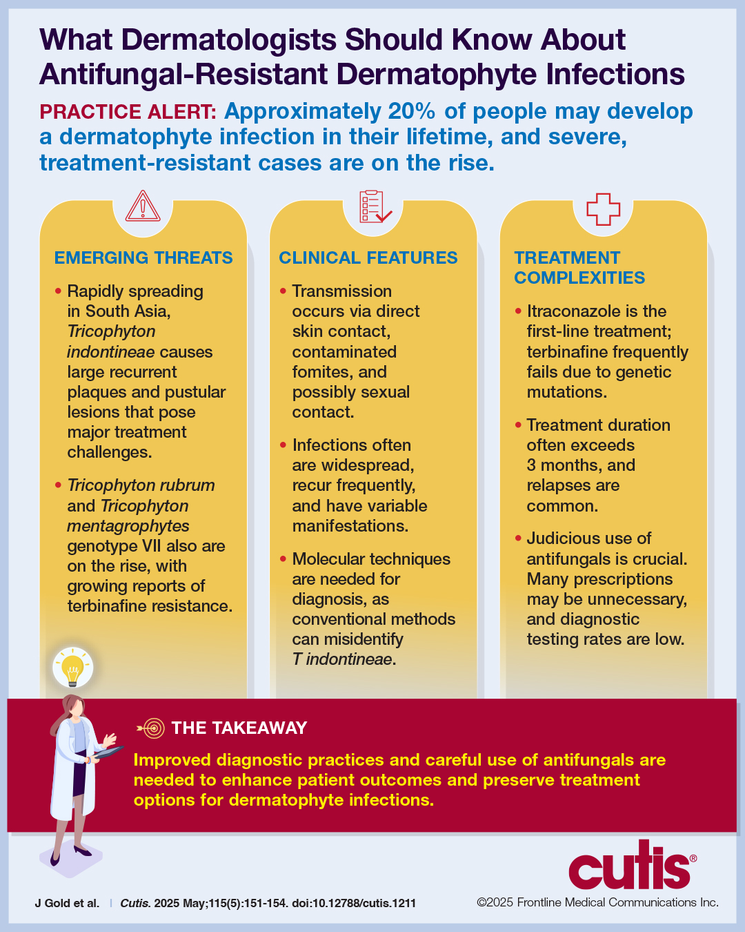 - Dermatologists can educate nondermatologists on the importance of mycologic confirmation and avoidance of the use of topical antifungal/ corticosteroid products, which are hypothesized to contribute to emergence and spread of resistance.