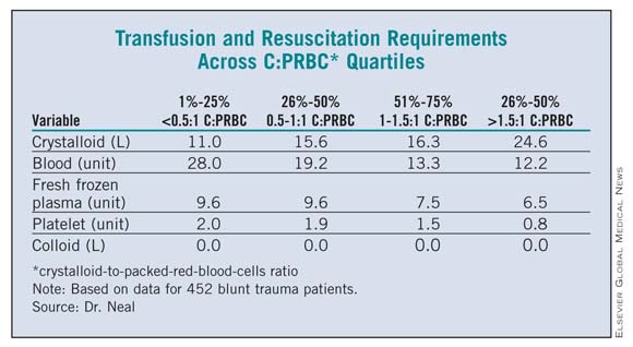 Appropriate ratios of blood and blood products in massive transfusion protocols have been the focus of much research, but crystalloid has yet to be studied in a ratio-based manner, despite its being a mainstay of resuscitation since the 1950s, Dr. Neal said. There are recommendations in the hemostatic resuscitation literature to minimize its use because of the cellular and inflammatory disturbances associated with crystalloid infusion in the setting of trauma and hemorrhagic shock, but no specific guidelines exist.