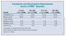 The finding is based on a secondary analysis of 452 blunt trauma patients who were transfused with a median of 17 L of crystalloid (C) resuscitation and a median of 16 units of packed red blood cells (PRBC) within the first 24 hours of admission. Overall mortality and multiple organ failure rates for the multicenter prospective cohort were 21% and 65%, respectively. Their median Injury Severity Score (ISS) was 34.