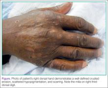 Patients with pseudoporphyria, an uncommon blistering skin disease, may initially present in the ED as the onset of this photosensitive condition can be acute—inciting patients to seek care urgently. The causes of pseudoporphyria may be drug-induced or related to hemodialysis, and it can develop even months to years after a patient with end-stage renal disease (ESRD) has been undergoing hemodialysis.1 Alternatively, patients can develop the condition weeks to months after starting certain medications (eg, nonsteroidal anti-inflammatory drugs [NSAIDs], tyrosine kinase receptor inhibitors, hormonal contraceptives, diuretics, antiandrogens, 3-hydroxy-3-methylglutaryl-coenzyme-A reductase inhibitors). Recent case reports associate finasteride, torsemide, and β-lactam antibiotics with pseudoporphyria.2,3
