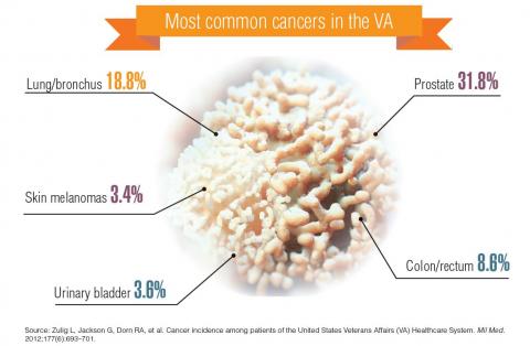 Veterans and civilians tend to face the same types of cancers. The most frequently diagnosed cancers are similar within both groups and include prostate, lung and bronchial, colorectal, urinary and bladder cancers, and skin melanomas. Despite the similarities, some veterans may be at increased risk for acquiring certain cancers.
