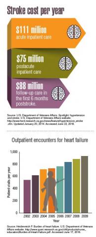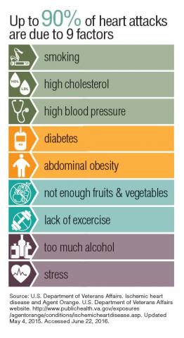 Most heart attacks are due to smoking, high cholesterol, high blood pressure, diabetes mellitus (DM), obesity, diet, lack of exercise, high alcohol use, and stress. Many of these risk factors trend higher for veterans. Within the VA, CVD is the top reason for hospitalization. Perhaps contributing to this, veterans have higher rates of DM, obesity, and smoking. Some veterans also are at higher risks due to exposure to hazardous materials. Veterans with ischemic heart disease who were exposed to Agent Orange or other herbicides during military service do not have to prove a service connection.