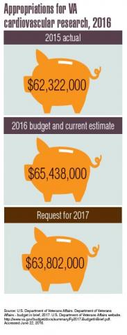 The VA also takes a prominent role in enabling research that addresses CVD. In 2015, it appropriated more than $62 million to fund heart disease/cardiovascular health research. The VA plans to increase funding for the 2017 budget and requested nearly $64 million for CVD research.