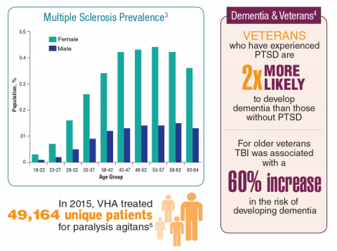 Neurologic disorders seem to impact veterans disproportionately. Multiple sclerosis, Parkinson disease, dementia, epilepsy, and other less common neurologic disorders require a high-level of care for veterans.