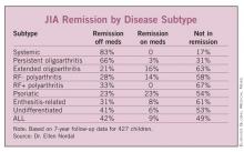 The mean follow-up period was 98 months. By that time, 42% were in remission and off medication. However, more than half of the group (58%) were either not in remission (49%) or in remission on medication (9%) said Dr. Nordal, a pediatric rheumatologist at the University Hospital of North Norway, Troms?.