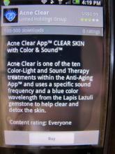 A quick check of the Android marketplace from my smartphone found, "Acne Clear," from United Holdings Group, being sold at .99 cents. It supposedly "uses a specific sound frequency and a blue color wavelength from the Lapis Lazuli gemstone to help clear and detox the skin." United also markets a "Skin Cleanser" app that supposedly uses a sound frequency and "a yellow color wavelength from the Imperial Topaz gemstone to help clean the skin of dark spots, sun spots, and acne scars." It's also .99 cents.