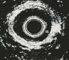 These ultrasound images show 2 discrete rings of tissue: The inner hypoechoic ring represents the internal anal sphincter and the outer hyperechoic ring represents the external anal sphincter (FIGURE 3). Disrupted continuity of these rings is consistent with structural damage to the sphincter.