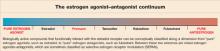 Commonly used medications that interact with the estrogen receptor can be arranged along a continuum from a “pure” estrogen agonist, such as estradiol, to a “pure” estrogen antagonist (antiestrogen), such as fulvestrant (Figure). Along this dimension, Premarin likely shares more properties with estrogen than other SERMs. In contrast, raloxifene probably shares more properties with a pure antiestrogen such as fulvestrant because, unlike tamoxifen and Premarin, raloxifene does not increase the risk of endometrial cancer.