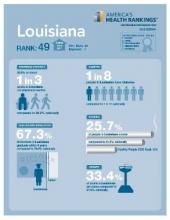 Obesity and diabetes in Louisiana rose through 2010, with a slight dip in 2011. Still, 33% of the state’s residents are obese. Although public health funding has increased over the past 5 years, the state is near or at the bottom for infectious diseases, preventable hospitalizations, violent crime, low birth weight, infant mortality, cancer deaths, and mental illness. The state is ranked 24th for the number of primary care physicians. One in five Louisianans were uninsured in 2011, up a bit from 17% in 2010. Gov. Bobby Jindal, recently sworn in as chairman of the Republican Governors Association, has said publicly that Louisiana will not expand Medicaid to 133% of the federal poverty level, as allowed under the ACA.